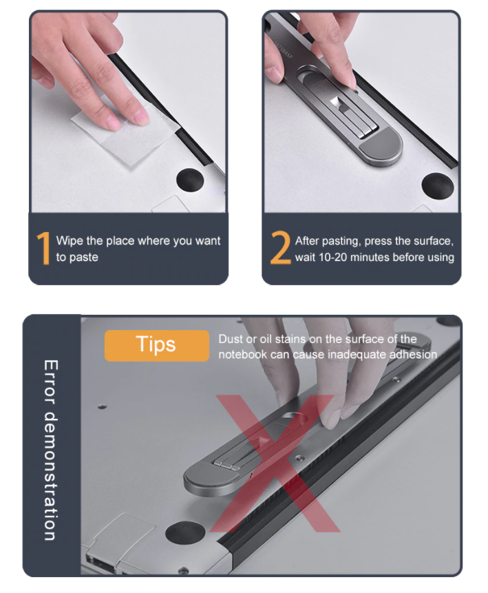- Thiết kế siêu mỏng, gọn, nhẹ, dán luôn ở mặt đáy của laptop, khi sử dụng chỉ cần gạt chân đế xuống. Khi không dùng nữa chỉ cần gạt chân đế lên, vô cùng tiện lợi