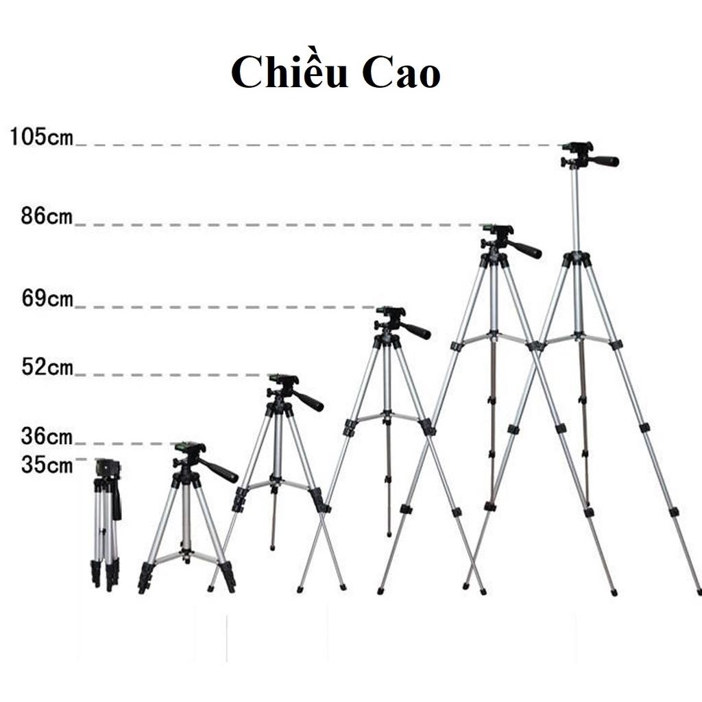 3 Chân có thể kéo dài hoặc chỉnh ngắn lại – Chiều Dài tối đa: 105Cm – Chiều dài Tối thiểu 35Cm – tải trọng tối đa là 1,5kg.