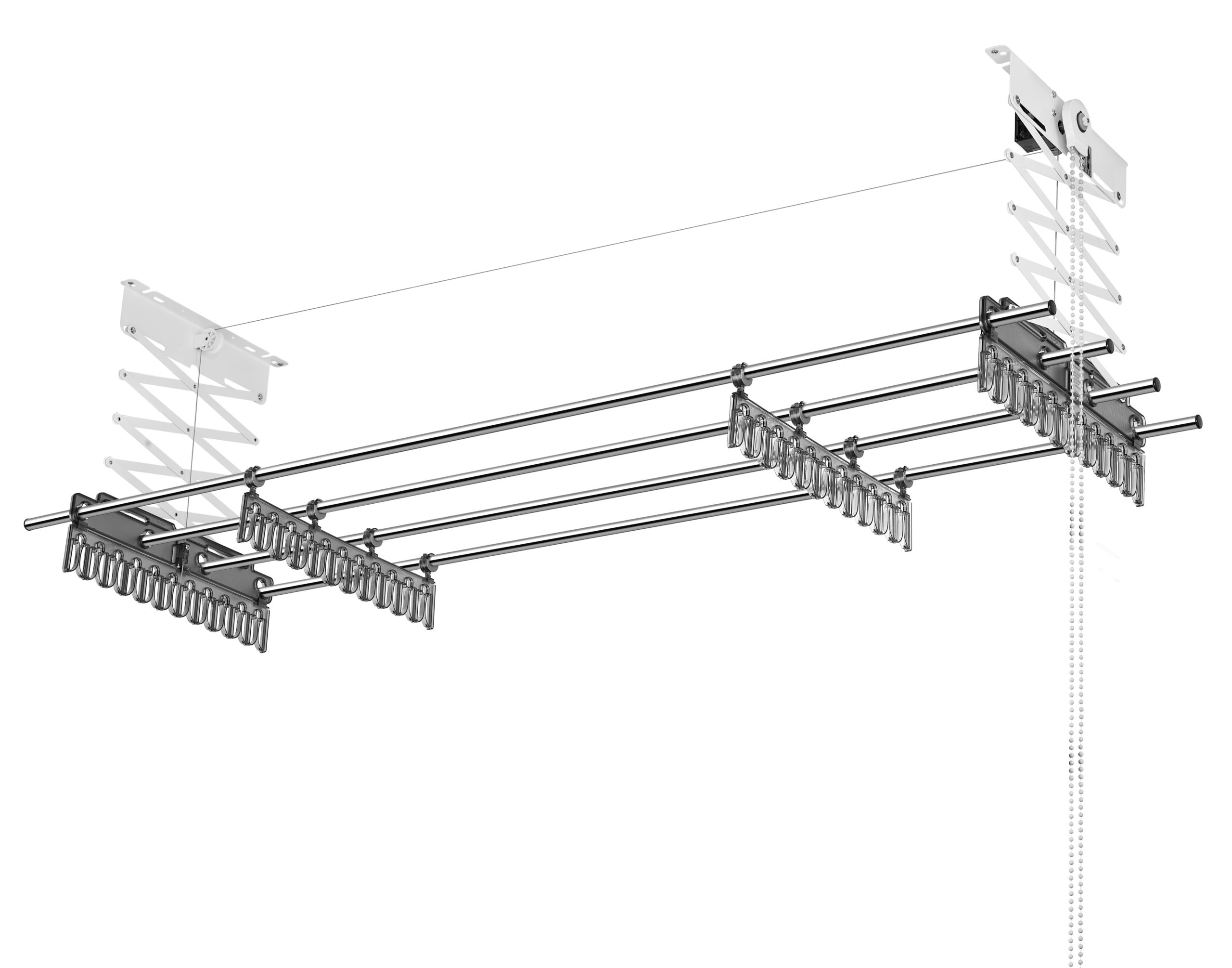Giàn phơi hoạt động nhờ hệ thống hộp số truyền động được thiết kế đặc biệt, và điều khiển truyền động bằng sợi bi giúp bạn dễ dàng thao tác nâng lên, hạ xuống giàn phơi một cách dễ dàng và nhẹ nhàng.