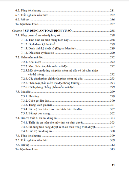 Chương 7: Sử dụng an toàn dịch vụ số, giới thiệu về khái niệm dấu chân kỹ thuật số và các nguy cơ mất an toàn thông tin. Các hướng dẫn về cách phân biệt hành vi trực tuyến như lừa đảo, bắt nạt, các loại phần mềm độc hại, thiết lập an toàn cho máy tính và trình duyệt web cũng được trình bày trong chương này.
