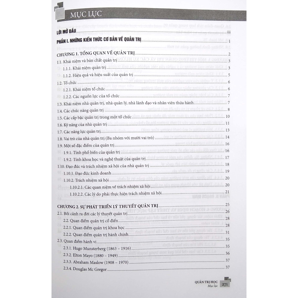 Giáo trình được bố cục thành 3 phần chính với tổng số 12 chương. Mỗi chương bao gồm các nội dung : mục tiêu chương, tình huống quản trị, nội dung chương, tóm tắt, sau cùng là câu hỏi ôn tập