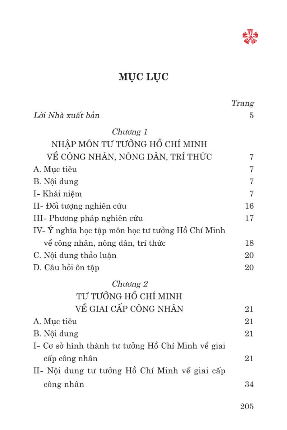 Giáo trình tư tưởng Hồ Chí Minh về công nhân, nông dân, trí thức . Giá bìa: 107.000 Nội dung bao gồm: 1.Chương 1 - Nhập môn tư tưởng Hồ Chí Minh về công nhân,