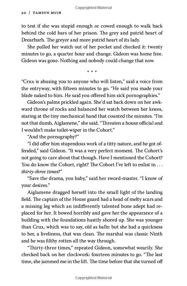 The Emperor needs necromancers. The Ninth Necromancer needs a swordswoman. Gideon has a sword, some dirty magazines, and no more time for undead bull****. Tamsyn Muir s Gideon the Ninth unveils a solar system of swordplay, cut-throat politics, and lesbian necromancers. Her characters leap off the page, as skillfully animated as arcane revenants. The result is a heart-pounding epic science fantasy. Brought up by unfriendly, ossifying nuns, ancient retainers, and countless skeletons, Gideon is ready to abandon a life of servitude and an afterlife as a reanimated corpse. She packs up her sword, her shoes, and her dirty magazines, and prepares to launch her daring escape. But her childhood nemesis won t set her free without a service. The emperor has called his necromancers to action, and Harrowhark is set on Gideon attending her as bodyguard. If Gideon survives, she ll be a hero, and a free woman. If not, she can look forward to eternity as a shambling bone-servant.