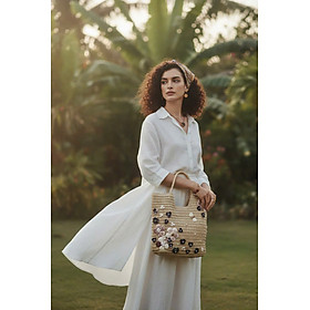 - Chất liệu giỏ: cói giấy, canvas - Chất liệu trang trí: vỏ sò, ốc đã qua xử lý chống ẩm mốc - Nghệ nhân trang trí: Minh Thu Từ mạch đất Mẹ, sự sống