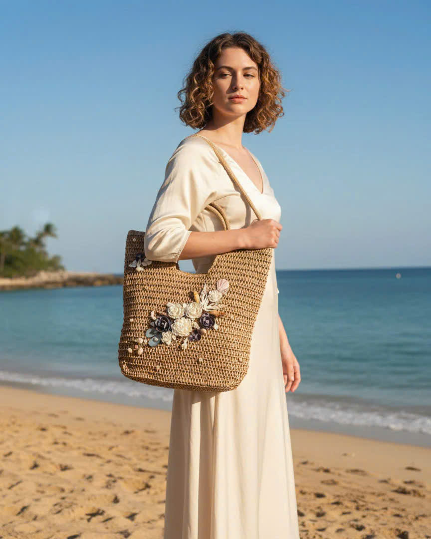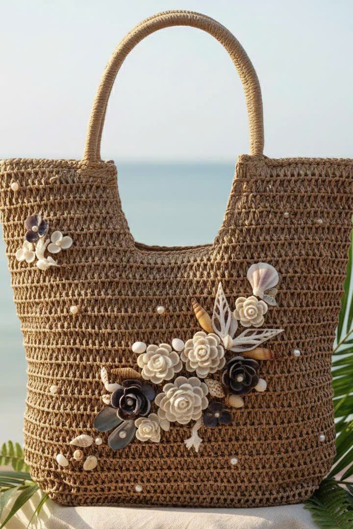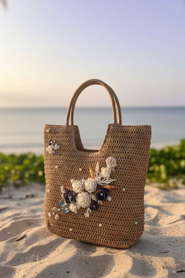 - Chất liệu giỏ: cói giấy, canvas - Chất liệu trang trí: vỏ sò, ốc đã qua xử lý chống ẩm mốc - Nghệ nhân trang trí: Minh Thu Từ mạch đất Mẹ, sự sống