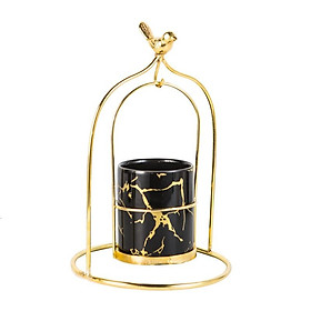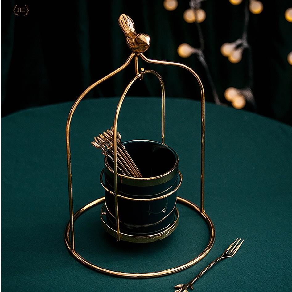 Lồng chim decor đựng dĩa , thìa đồ ăn trang trí , thiết kế độc đáo , hình lồng chim mạ vàng , cốc bằng sứ thiết kế theo phong cách bắc âu