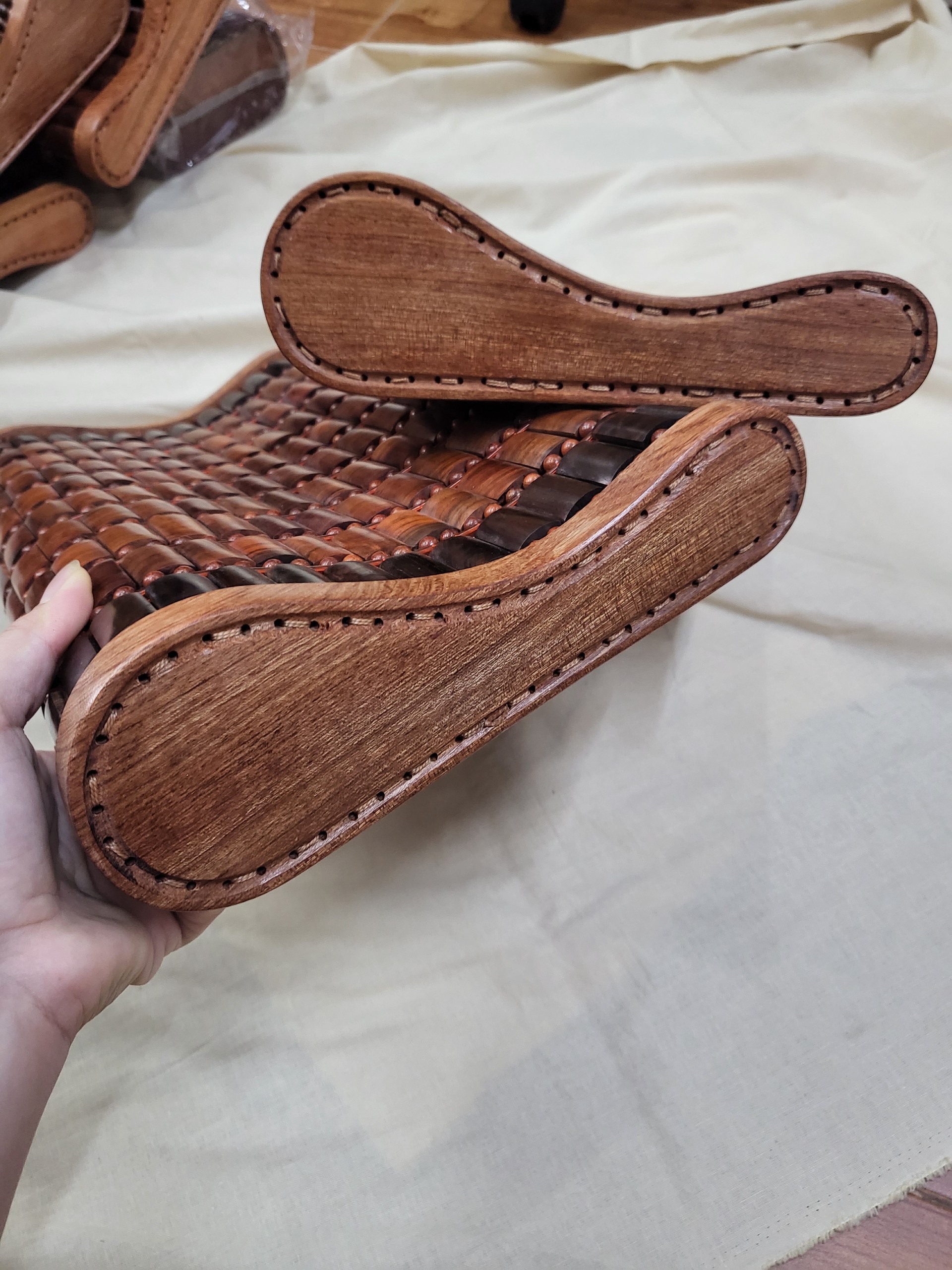- Chất liệu : Gỗ Trắc tự nhiên Hạt gỗ rắn chắc , có mùi thơm nhẹ , những hạt gỗ chọn và nhặt tỉ mỉ trong quá trình đan gối .