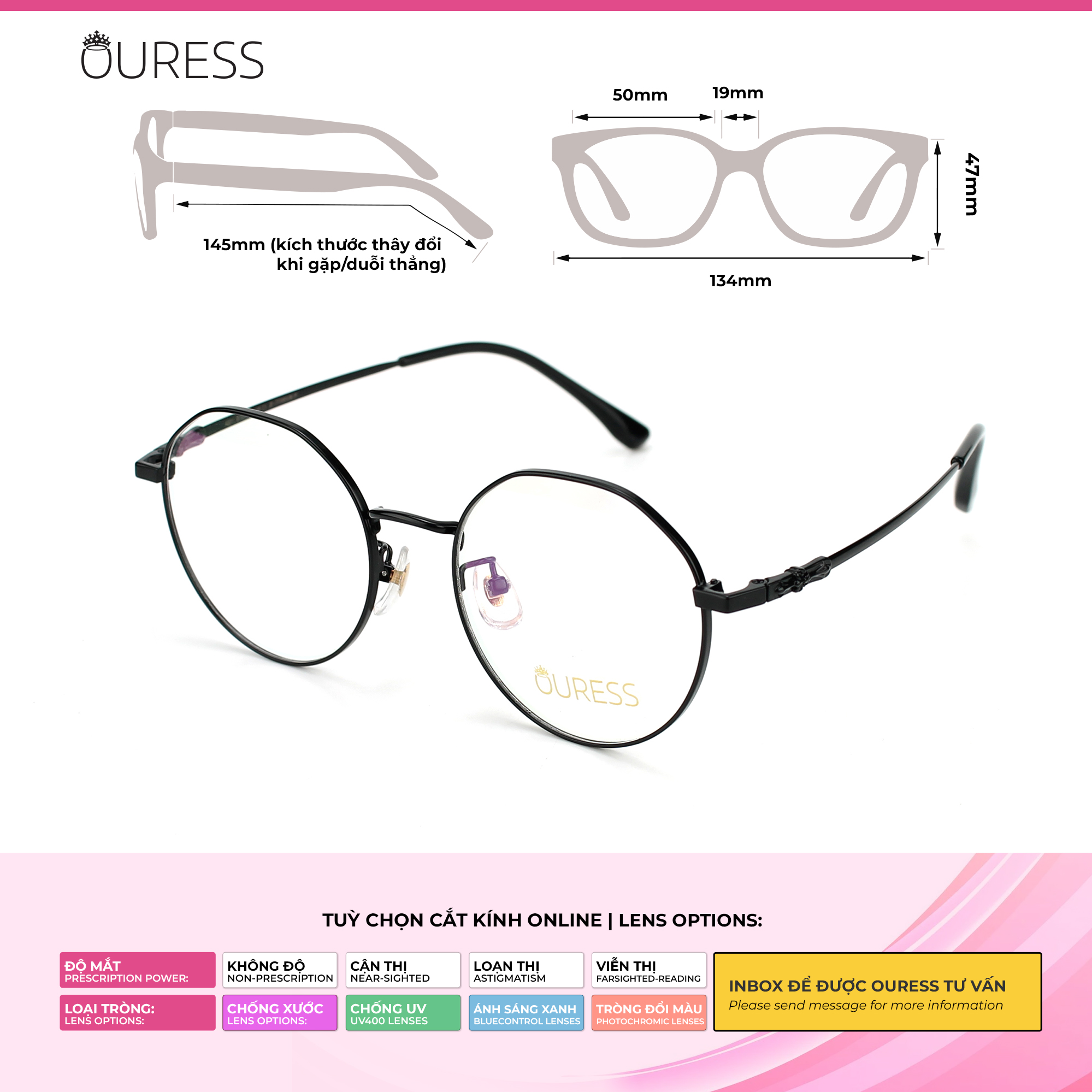 HƯỚNG DẪN CÁCH ĐỌC THÔNG SỐ GỌNG KÍNH: Thông thường, nhà sản xuất sẽ in thông số trên tròng kính hoặc càng kính để người dùng hình dung về các kích thước của gọng kính. Ví dụ, trên tròng kính bạn thấy một dãy số: H0011 50-19-145: •H0011: là mã gọng kính • 50: ngang khung tròng kính là 50 mm • 19 : cầu mũi là 19 mm • 145 : chiều dài càng kính 145mm •Cao kính : 47 mm •Chiều ngang tổng thể gọng kính: 134 mm ++ Mã này là size kính dành cho gương mặt nhỏ và vừa . *** tỷ lệ chênh lệch thông số +/- 2mm. Qúy khách có thể liện hệ shop để được tư vấn chọn gọng kính phù hợp với size gương mặt mình nhé vì đây chỉ là thông số tham khảo —-------------------------------------- Bộ phụ kiện đi kèm theo Kính Ouress gồm: -Khăn lau kính và hộp đựng kính ( bộ phụ kiện này không áp dụng cho những sản phẩm sale trên 40% )