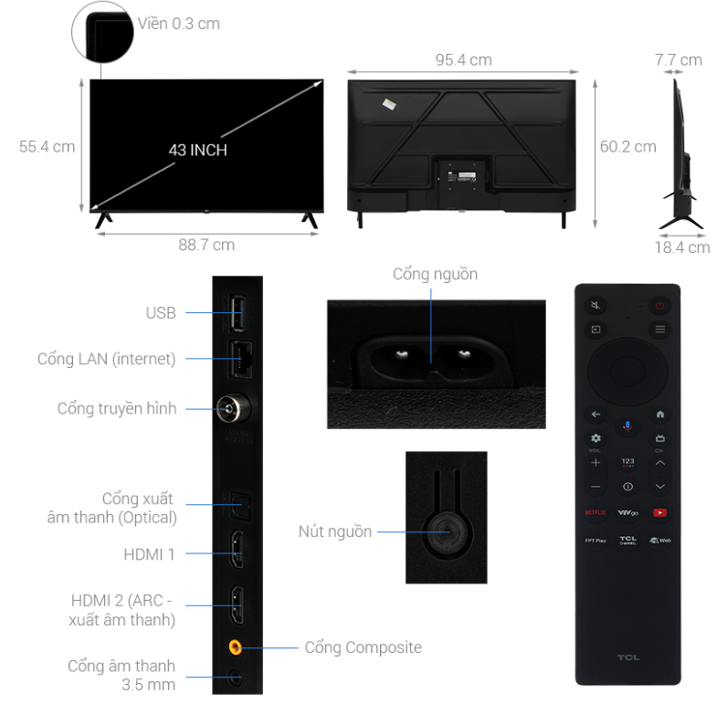 THÔNG SỐ SẢN PHẨM Màn hình 43 inch Kích thước (có chân đế) 954.5 x 199.2 x 603mm Trọng lượng (có chân đế) 6kg Kết nối KTS DVB-T2, DVB-C Cổng internet LAN Bộ nhớ RAM: