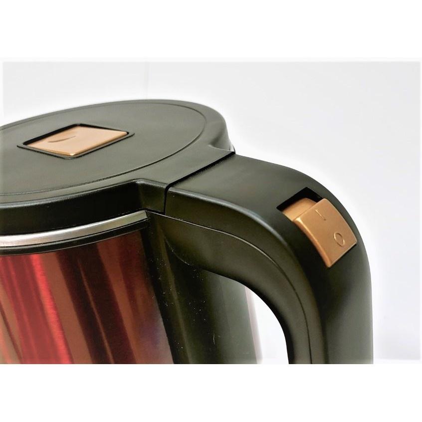 Dung tích: 1.7L Công suất: 1800W Ưu điểm nổi bật: 2 lớp cách nhiệt: Thép không gỉ bên trong, nhựa mát tay bên ngoài – an toàn tuyệt đối, nhất là với gia đình có