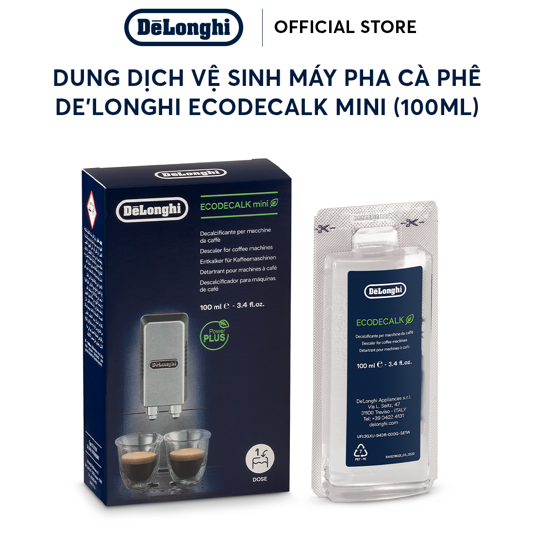 - Dung dịch vệ sinh máy pha cà phê De'Longhi EcoDecalk là 1 loại dung dịch tẩy cặn canxi dạng lỏng dùng để tẩy cặn vôi máy pha cà phê. Dung dịch tẩy cặn canxi