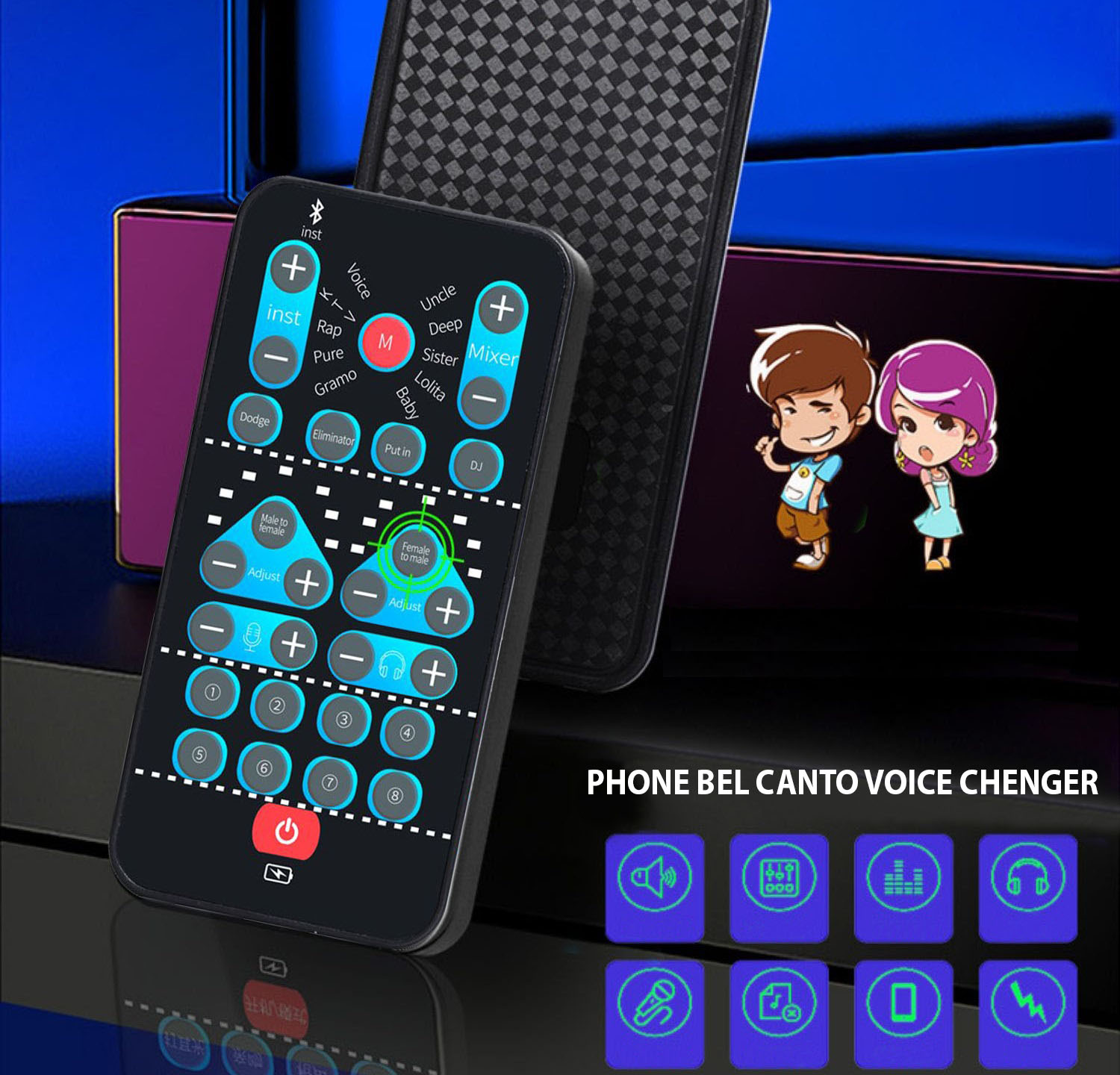 - 8 chế độ âm thanh: Nam sang nữ, nữ sang nam, bé gái, bé yêu, giọng nói ma thuật, giọng nói sâu sắc, Optimus Prime.