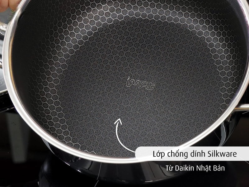 Nồi inox thân 3 lớp, lớp chống dính bên dưới trụ inox đến từ hãng Daikin Nhật Bản. Thân nồi dày giữ nhiệt nên nấu nhanh hơn. Có thể vệ sinh trong máy rửa chén và không kén bếp: dùng tốt trên cả bếp từ, điện, gas, hồng ngoại...