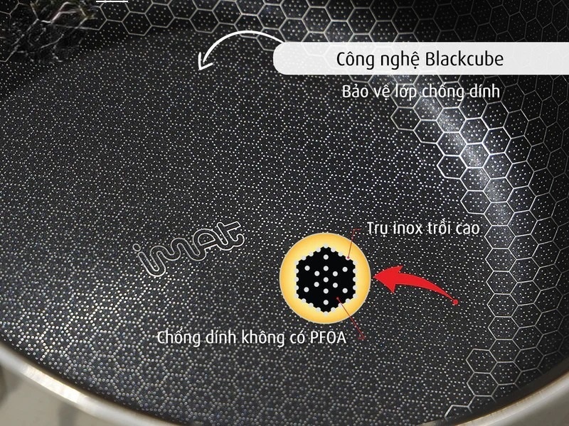 BLACKCUBE là khắc bề mặt inox để làm trồi lên những trụ nhỏ xếp hình tổ ong, trụ inox trồi cao che chắn và bảo vệ những tác động từ các dụng cụ nấu ăn lên lớp không dính. Lớp không dính của hãng Daikin, Nhật bản không PFOA tốt cho sức khoẻ.