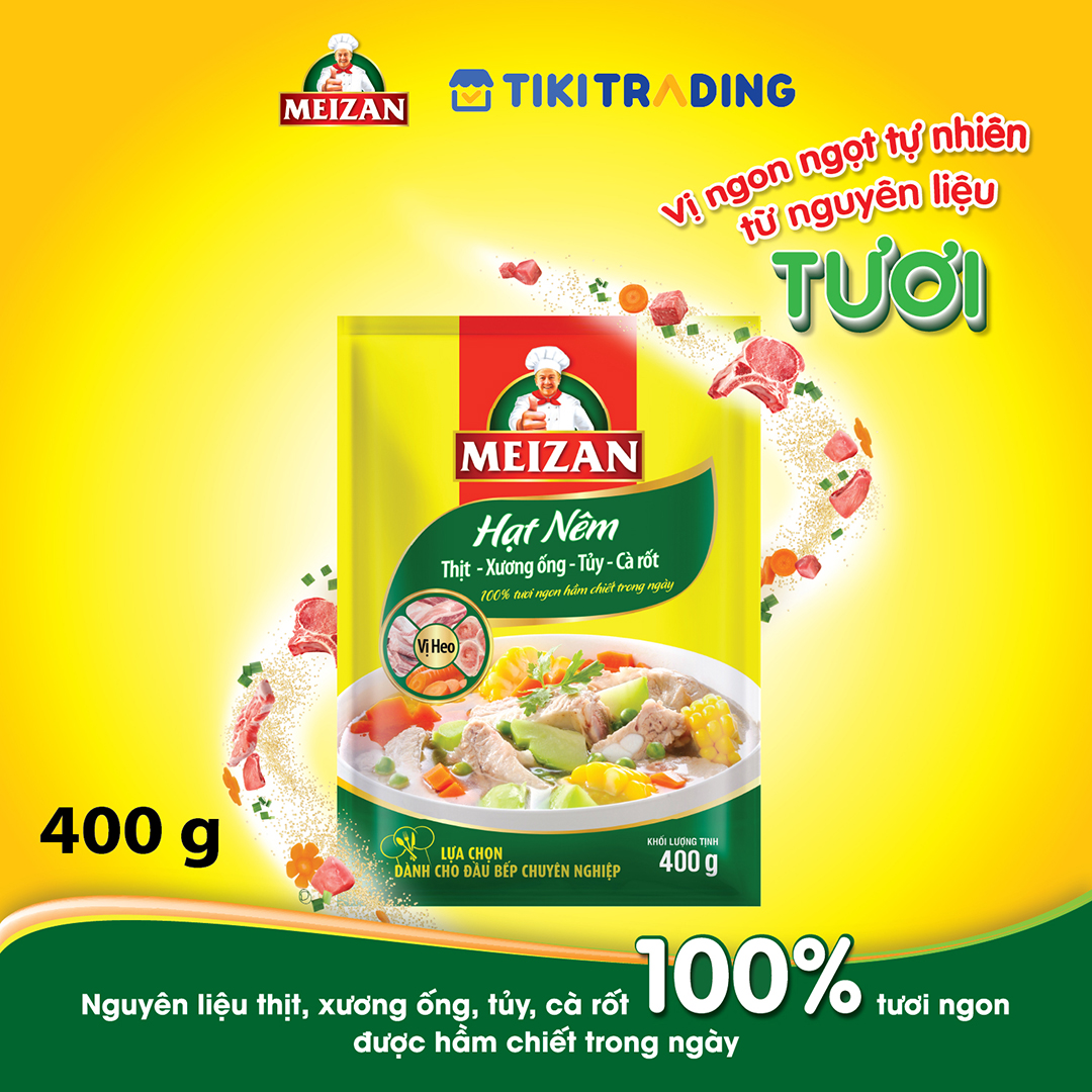 HẠT NÊM MEIZAN THỊT - XƯƠNG ỐNG - TỦY - CÀ RỐT - VỊ HEO Đặc tính sản phẩm: - Từ 4 nguyên liệu 100% tươi ngon, chọn lọc gồm thịt heo, xương ống, tủy