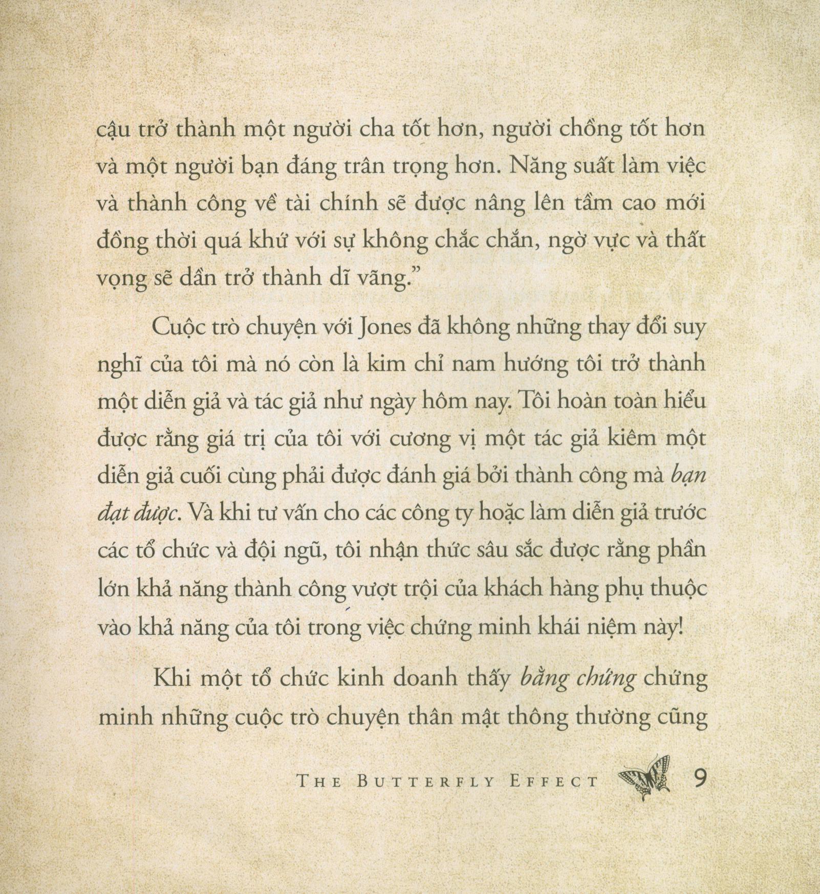 Trong cuốn sách Hiệu Ứng Cánh Bướm này, Andy Andrews sẽ cung cấp cho chúng ta những ví dụ, cụ thể, sinh động cùng những lời lý giải ngắn gọn, súc tích cho hiện tượng vật lý thú vị này. Chúng ta sẽ biết rằng, chính những hành động nhỏ bé của mình sẽ là khởi nguồn của các kết quả lớn nhiều năm sau đó.