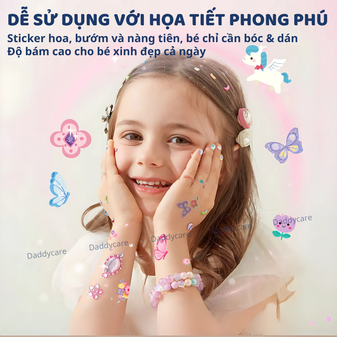- HƠN 1000 STICKER: Tô điểm cho bé từ đầu đến chân với miếng dán móng, hình xăm, và miếng dán đính đá cho mọi vị trí bé thích, từ móng tay, bàn tay đến má!