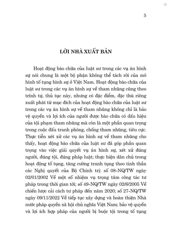Mua tại TiktokCuốn sách Hoạt động bào chữa của luật sư trong các vụ án hình sự về tham nhũng ở Việt Nam hiện nay do TS.LS. Nguyễn Thị Huyền Trang biên soạn. Nội dung cuốn sách trình bày một số vấn đề lý luận, phân tích nội dung các quy định pháp luật và thực trạng thực hiện các quy định pháp luật về hoạt động bào chữa của luật sư trong các vụ án hình sự về tham nhũng, từ đó đề xuất các giải pháp nâng cao hiệu quả hoạt động bào chữa của luật sư trong các vụ án hình sự về tham nhũng. Trân trọng giới thiệu cuốn sách với bạn đọc.