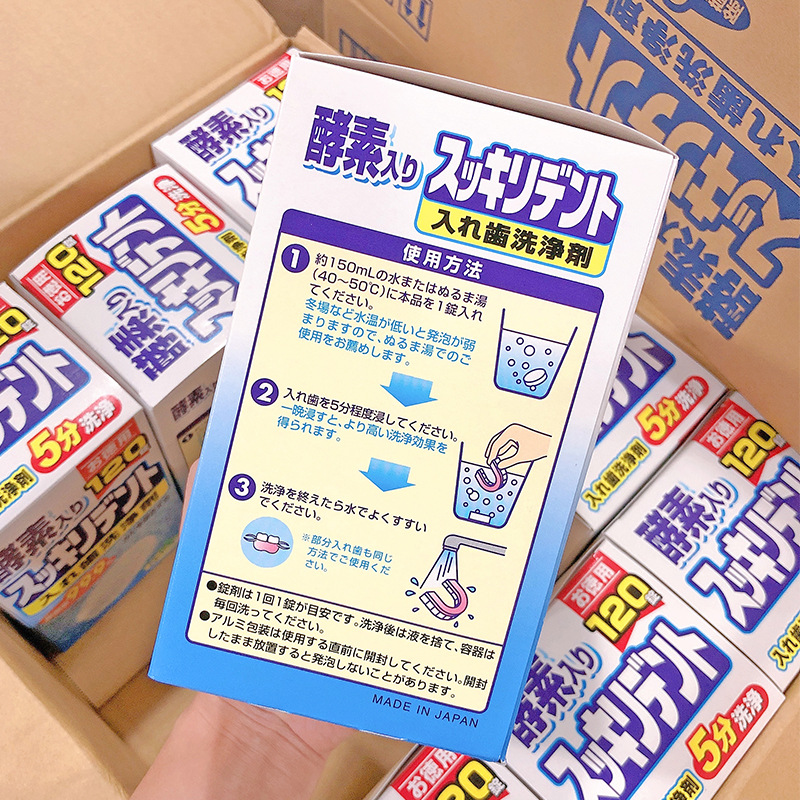 Xuất xứ: Nhật Bản Đóng gói: Hộp 120 viên Vỉ viên vệ sinh khay niềng răng trong Nhật Bản làm sạch khay niềng răng & các loại khi cụ nha khoa tháo lắp như hàm