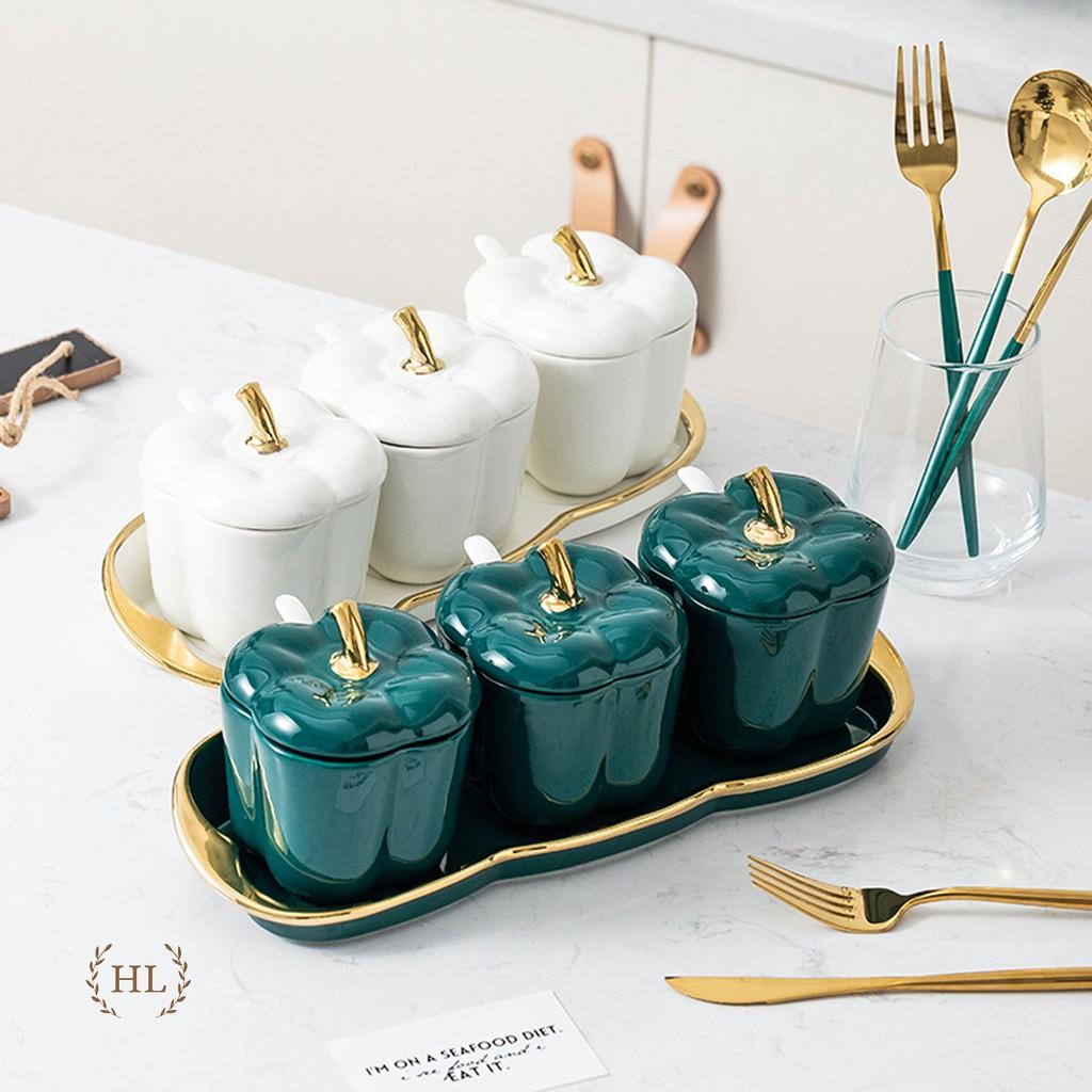 ✨HŨ ĐỰNG GIA VỊ BẰNG SỨ KIỂU DÁNG ỚT CHUÔNG PHONG CÁCH VINTAGE | BỘ GIA VỊ SỨ 3 KÈM ĐẾ SỨ CAO CẤP KẺ CHỈ VÀNG KIM DECOR