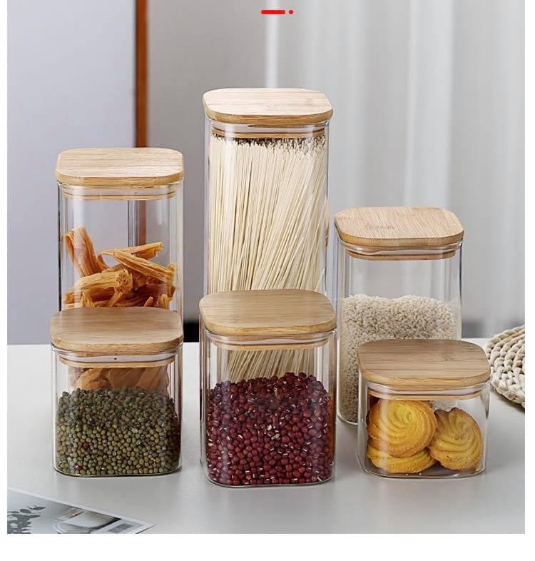 Hũ thuỷ tinh nắp gỗ dáng vuông độc đáo để đựng các loại hạt, đồ khô hay bánh kẹo, mì khô vừa đẹp, lại sạch sẽ, gọn gàng Hũ có nắp gỗ có gioăng silicone