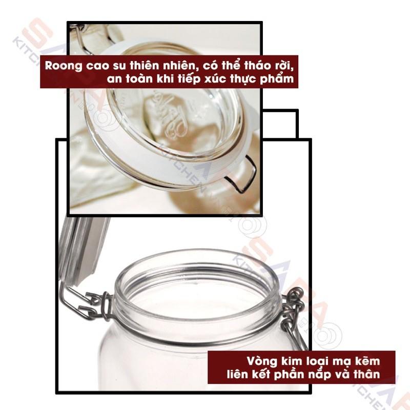Nắp đậy thủy tinh kín hơi với miếng đệm cao su và khóa cài an toàn bằng kim loại có thể tháo rời giúp giữ thực phẩm tươi ngon hơn. Thủy tinh dầy, có độ bền cao và an toàn khi dùng cất trữ thực phẩm.
