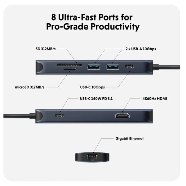 Cổng: 4K60Hz HDMI, USB-C 10Gbps, 2 x USB-A 10Gbps, microSD 312MB/s, SD 312MB/s, Gigabit Ethernet, USB-C 140W PD 3.1