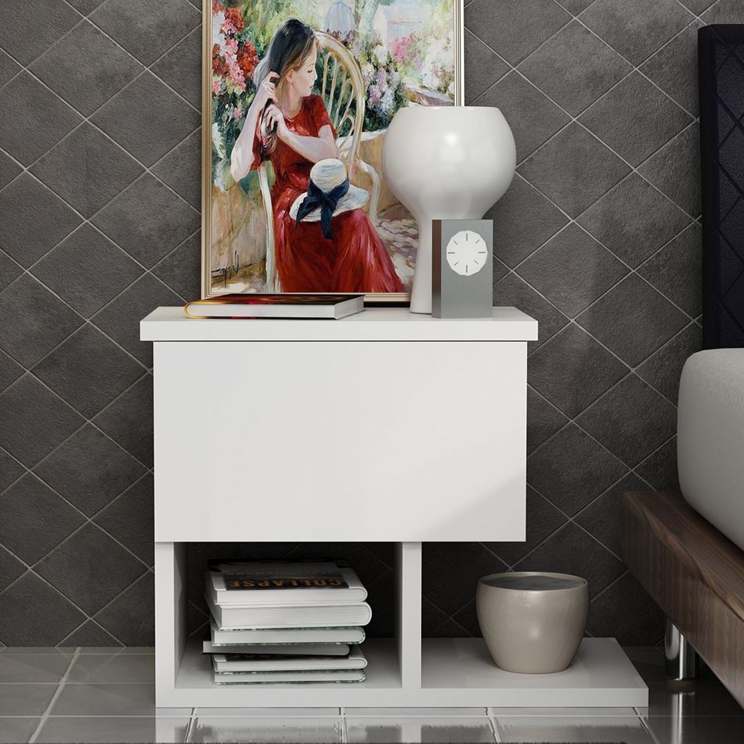 - Kệ tủ đầu giường hình vuông có hộc kéo - Chất liệu: ván gỗ HMR (viết tắt của High Moisture Resistence) lõi xanh chống ẩm, chống thấm nước phủ melamine, phun sơn trắng bóng