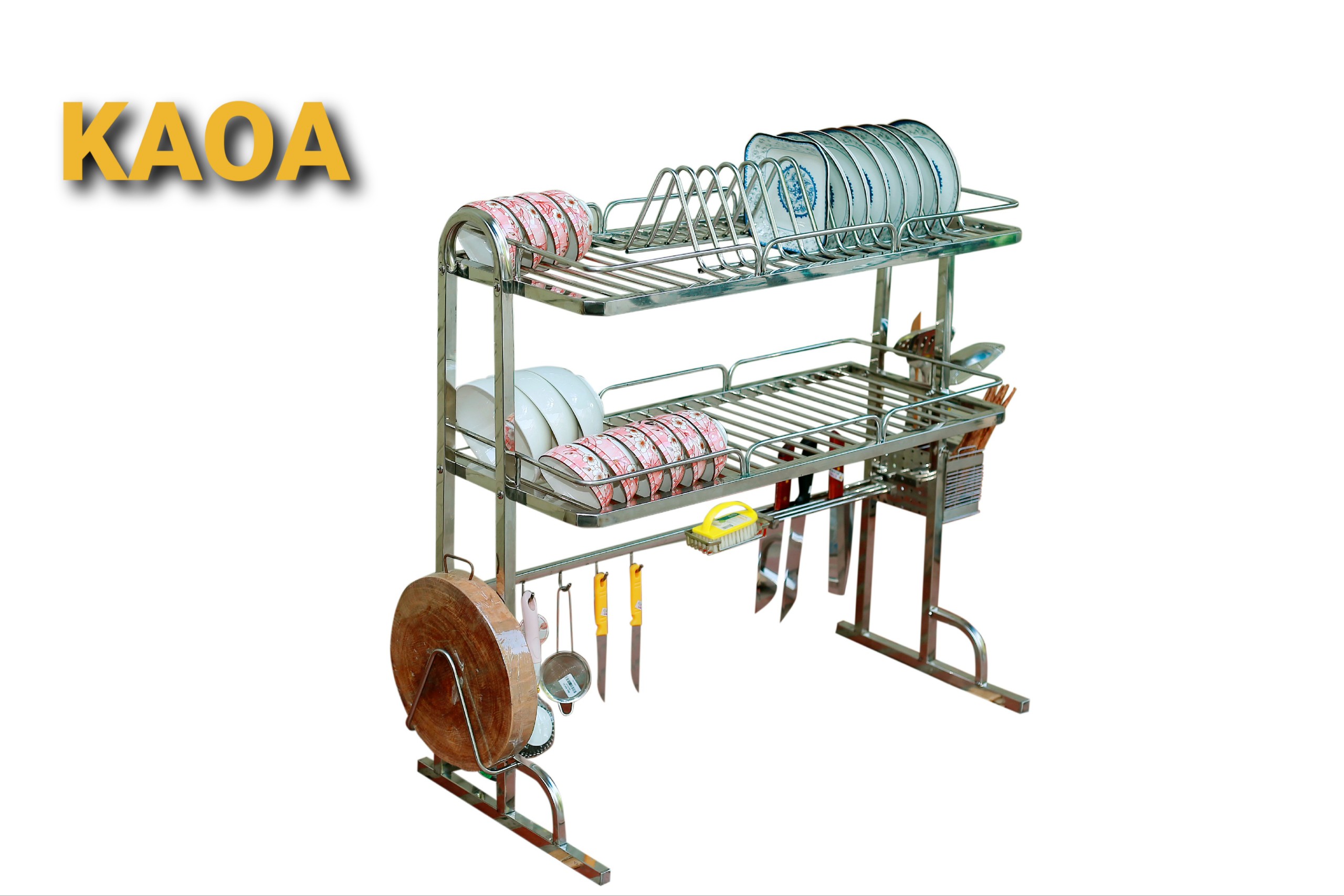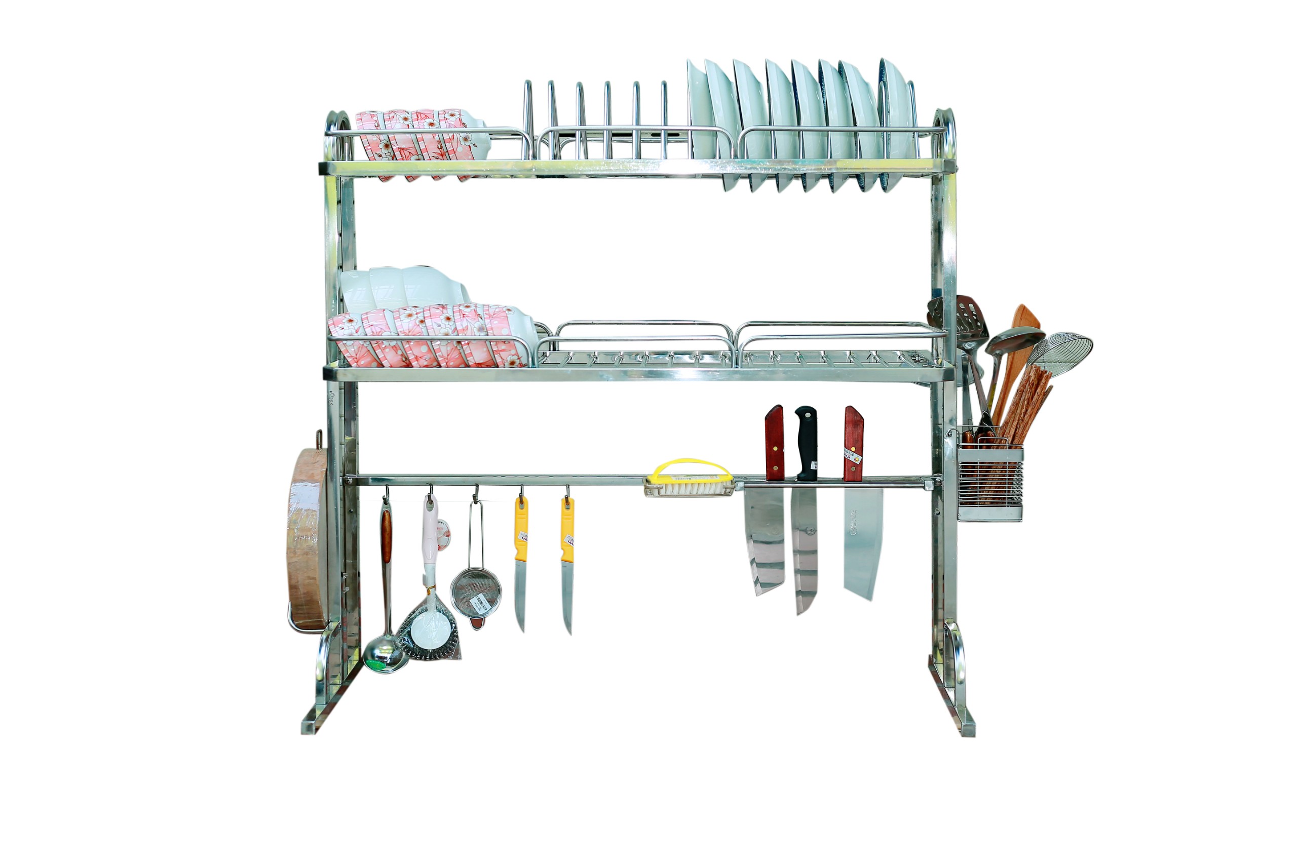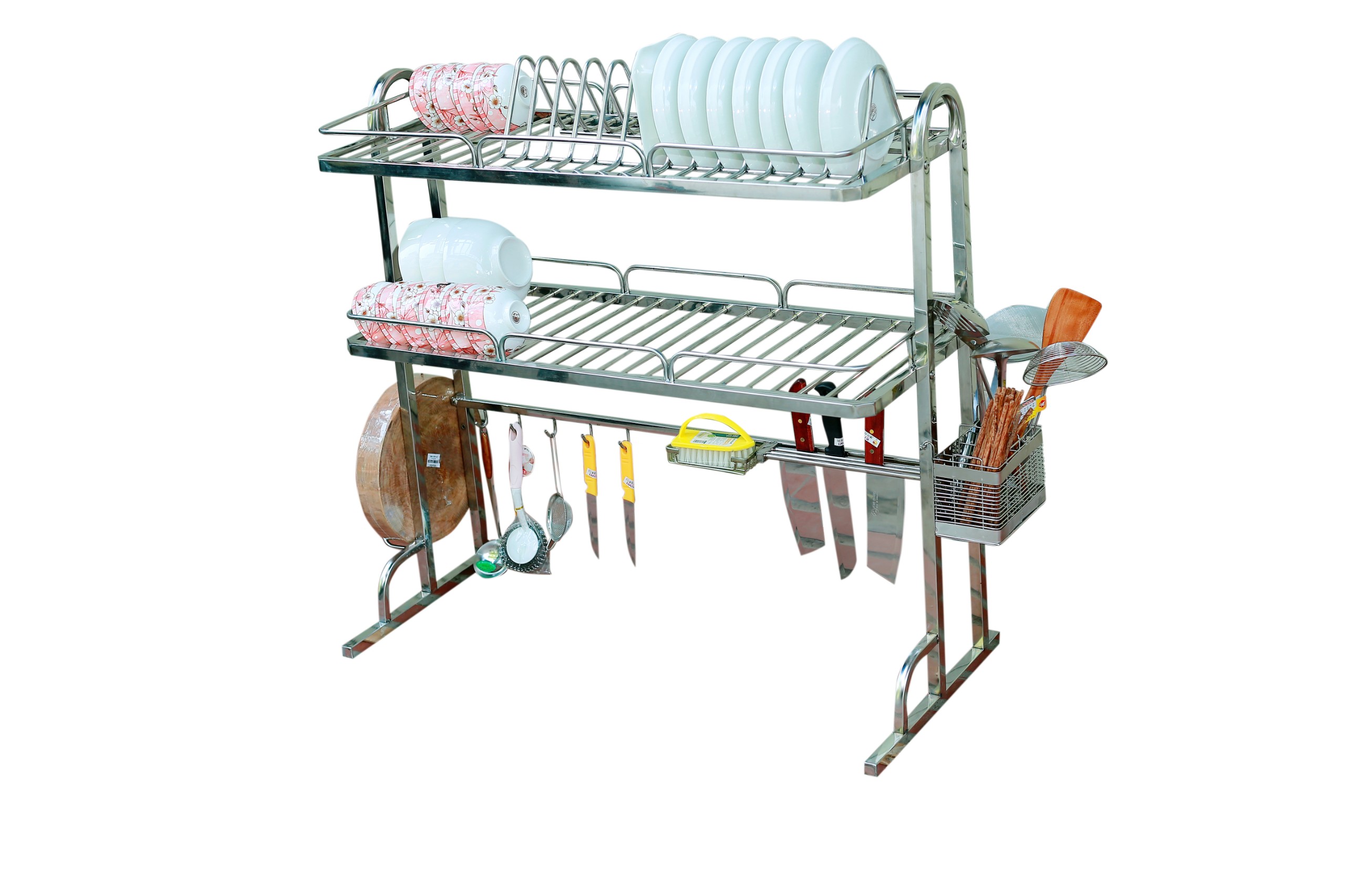 - Bộ sản phẩm đày đủ: Kệ để chén đĩa, giá để dao đũa thìa, giá để thớt, giá để nước rửa bát, khăn lau bát, 6 móc treo nồi.