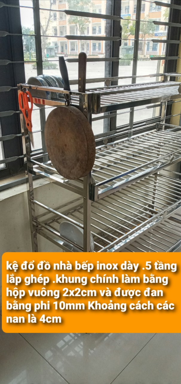 Mua tại Tiktokcty inox khởi hòa chuyên sx các sp về inox , với dòng sp kệ để đồ nhà bếp được cty sx như sau 1/ khung chính của kệ được làm bằng hộp vuông 2x2 cm ,các tầng của kệ được đan bằng phi 10mm ,khoảng cách các nan là 4cm 2 / kích thước kệ cao 130cm .dài 104cm, sâu 40cm 3 / kệ được thiết kế 5 tầng và được lắp ghép bằng bulong inox 4 / kệ dùng cho soong nồi ,bát đĩa ,dao thớt vv
