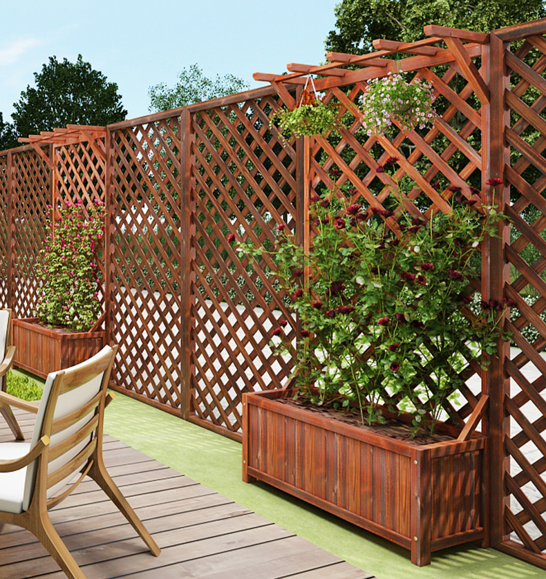 Kệ vách ngăn trang trí sân vườn mẫu mới nhất có thêm giá treo chậu cây và bồn để chậu hoa cây cảnh kiểu dáng vintage được sản xuất chuyên dụng để ngoài trời, đảm bảo chống cong vênh mối mọt.