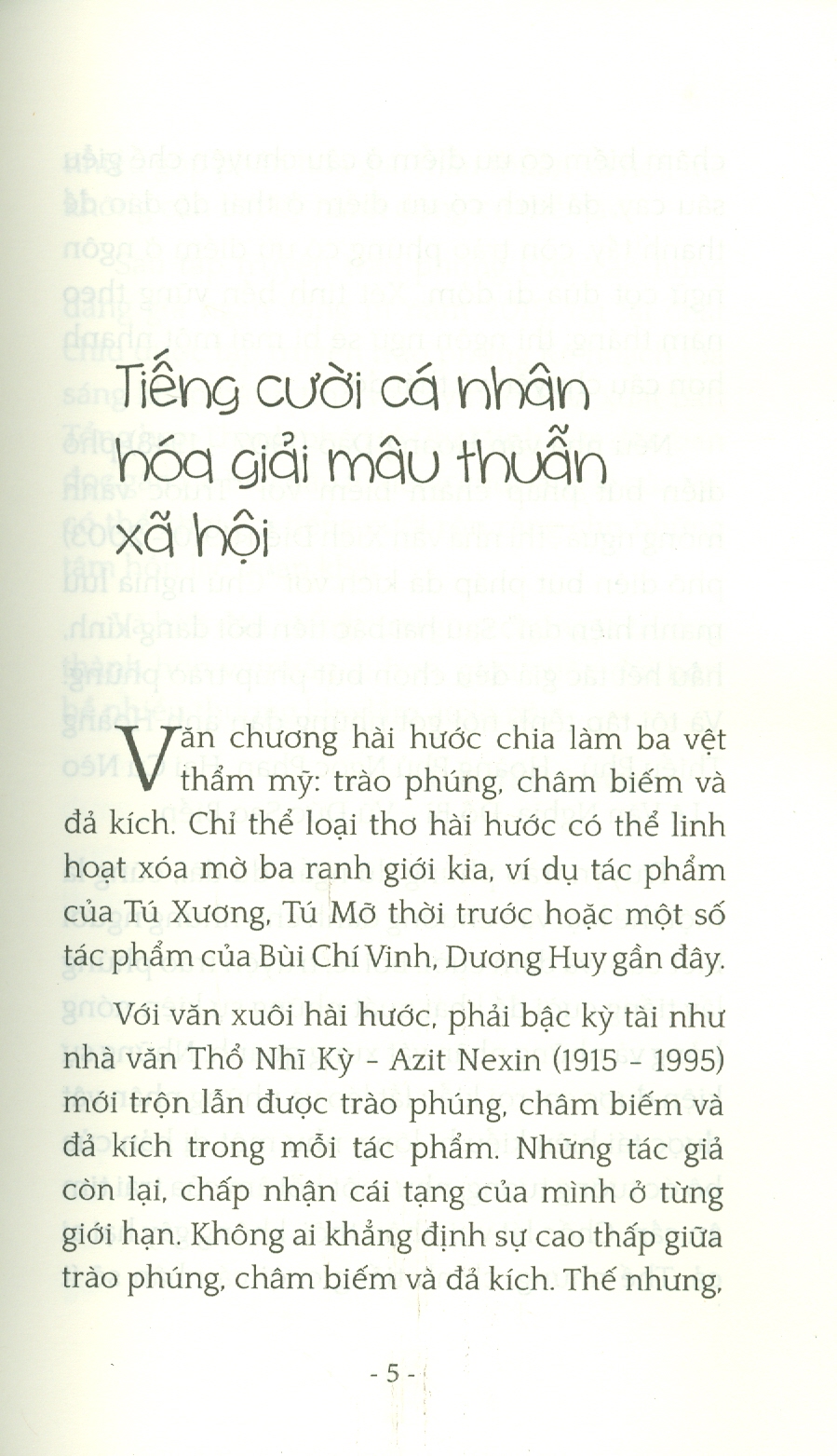 Mua tại TiktokTruyện trào phúng dù ngăn dù dài, cũng là một thể loại văn chương dành cho những người biết cười và dám cười. Bởi lẽ, truyện trào phúng lấy tiếng cười để khái quát những sự kiện nóng bỏng và những nhân vật xung quanh. Những sự kiện được soi rọi kiểu lắt léo và những nhân vật được tái hiện kiểu hí lộng, như một dị bản của bộ óc tưởng tượng, như một hồi âm của trái tim ân cần. Chốc lát vui nhộn thôi, không gây hại ai cả. Thế nhưng, chính tiếng cười cá nhân sẽ ít nhiêu góp phần hóa giải mâu thuẫn xã hội, mà không cần bất kỳ hành động cụ thể nào.