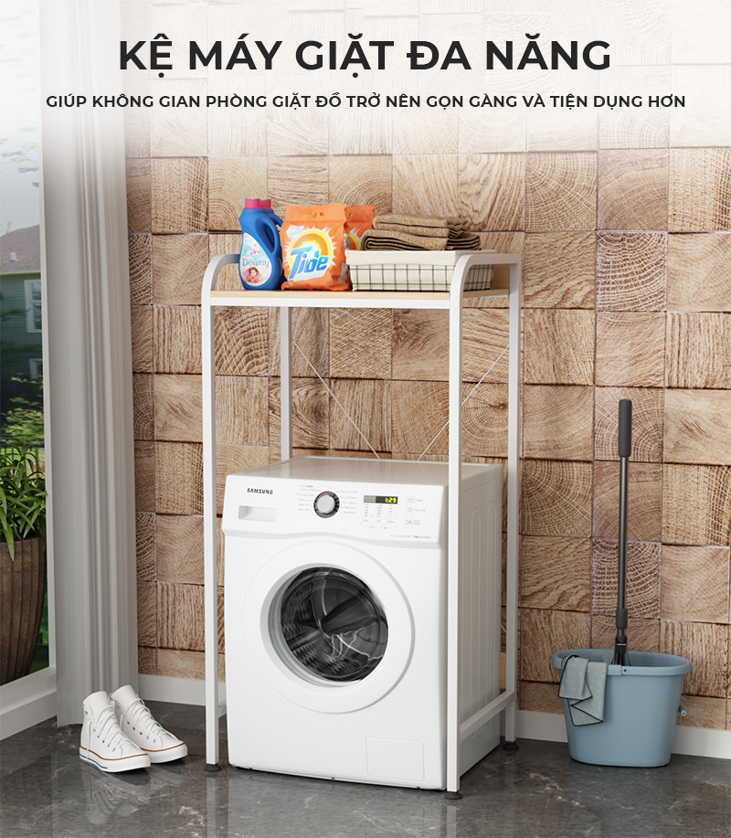 Công năng: Là mẫu kệ máy giặt giúp bạn sắp xếp đồ đạc và dụng cụ phòng giặt gọn gàng đặc biệt là các căn hộ có diện tích hạn chế.