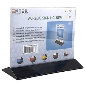 Mô tả sản phẩm Quy cách:                    Thân 12 x 26cm                                      Đế 5.5 x 29cm Đơn vị tính:                 Cái Đóng gói:                    1 Xuất xứ:                       Việt Nam Chất liệu: Kệ mica 2 mặt Enter E17B có thiết kế đơn giản, tuy nhiên lại tiện lợi khi sử dụng, mang lại tính thẩm mỹ cao... Kệ được làm