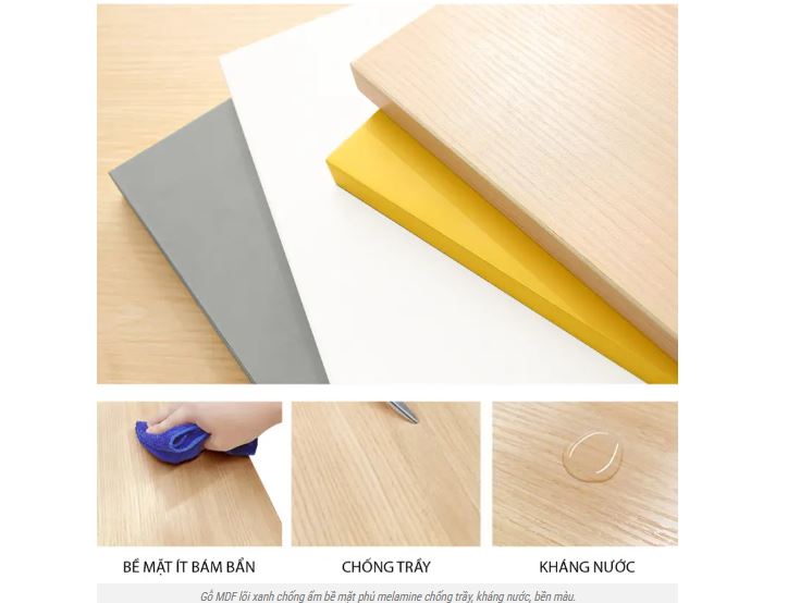 Chất liệu Gỗ MDF lõi xanh chống ẩm, độ dày 17mm, bề mặt phủ melamine đồng màu, căng phẳng có khả năng kháng nước, hạn chế trầy xước, lau sạch dễ dàng.