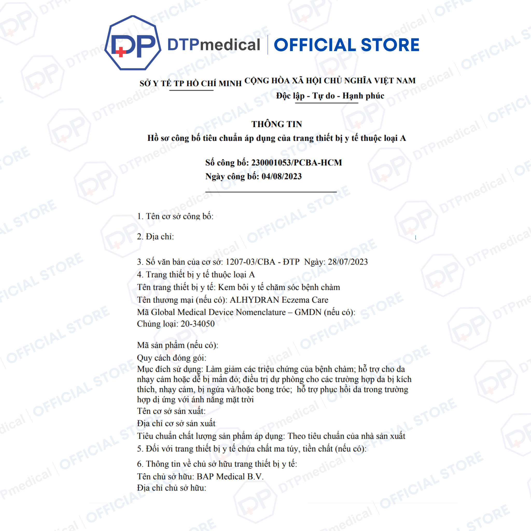 - BAP MEDICAL sử dụng công thức đã được chứng minh lâm sàng của ALHYDRAN để làm cơ sở. ALHYDRAN Eczema Care kết hợp các đặc tính độc đáo của gel Aloe Vera với các hoạt chất hiệu quả khác.