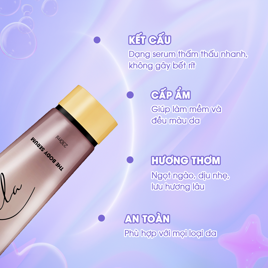 Mua tại TiktokTHÔNG TIN SẢN PHẨM Kem dưỡng ẩm The Body Serum myKella là giải pháp giúp làn da trắng mịn, căng bóng và thơm ngát, căng tràn sức sống. Nhờ công thức giàu dưỡng chất với Niacinamide và Vitamin E, sản phẩm giúp tái tạo làn da, làm mờ vết thâm, mang lại vẻ trắng sáng tự nhiên. Đặc biệt, hương thơm nhẹ nhàng, quyến rũ từ thành phần thiên nhiên giúp bạn thư giãn suốt 12 tiếng. THÔNG SỐ KỸ THUẬT