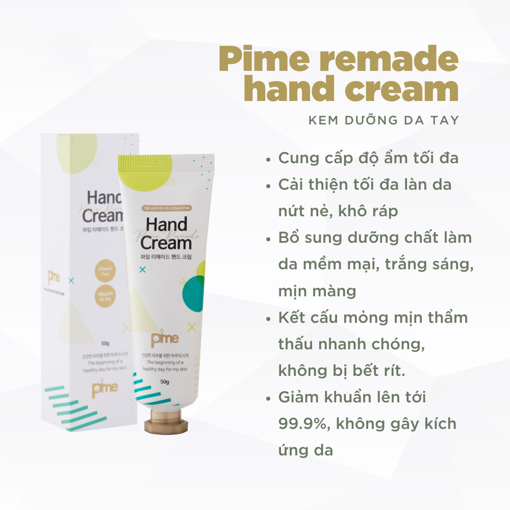 Kem dưỡng da tay Pime Remade chứa thành phần benzalkonium chloride có khả năng diệt khuẩn và bơ shea dưỡng ẩm siêu tốt cho làn da tay thô ráp mà không gây bết dính.