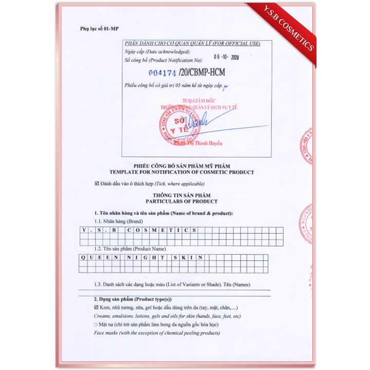 Mỗi sản phẩm Y.S.B COSMETICS đưa ra thị trường là cả một quá trình nghiên cứu, kiểm tra khắc khe và được kiểm nghiệm định kỳ, cấp phép bởi các Cơ quan có thẩm quyền cho phép lưu hành trong nước và quốc tế.