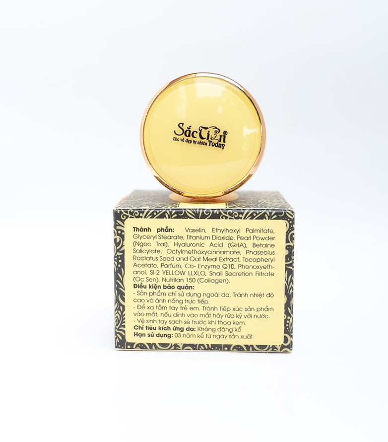 Thành phần: Vaselin, Ethylhexyl Palmitate, Glyceryl Stearate, Titanium Dioxide, Pearl Powder (Ngọc Trai), Betaine Salicylate, Octylmethoxycinnamate, Phaseolus Radiatus Seed and Oat Meal Extract, Tocopheryl Acetate, Parfum, Co-Enzyme Q10, SI-2 YELLOW LLXLO, Methylparaben, Propylparaben, Snail Secretion