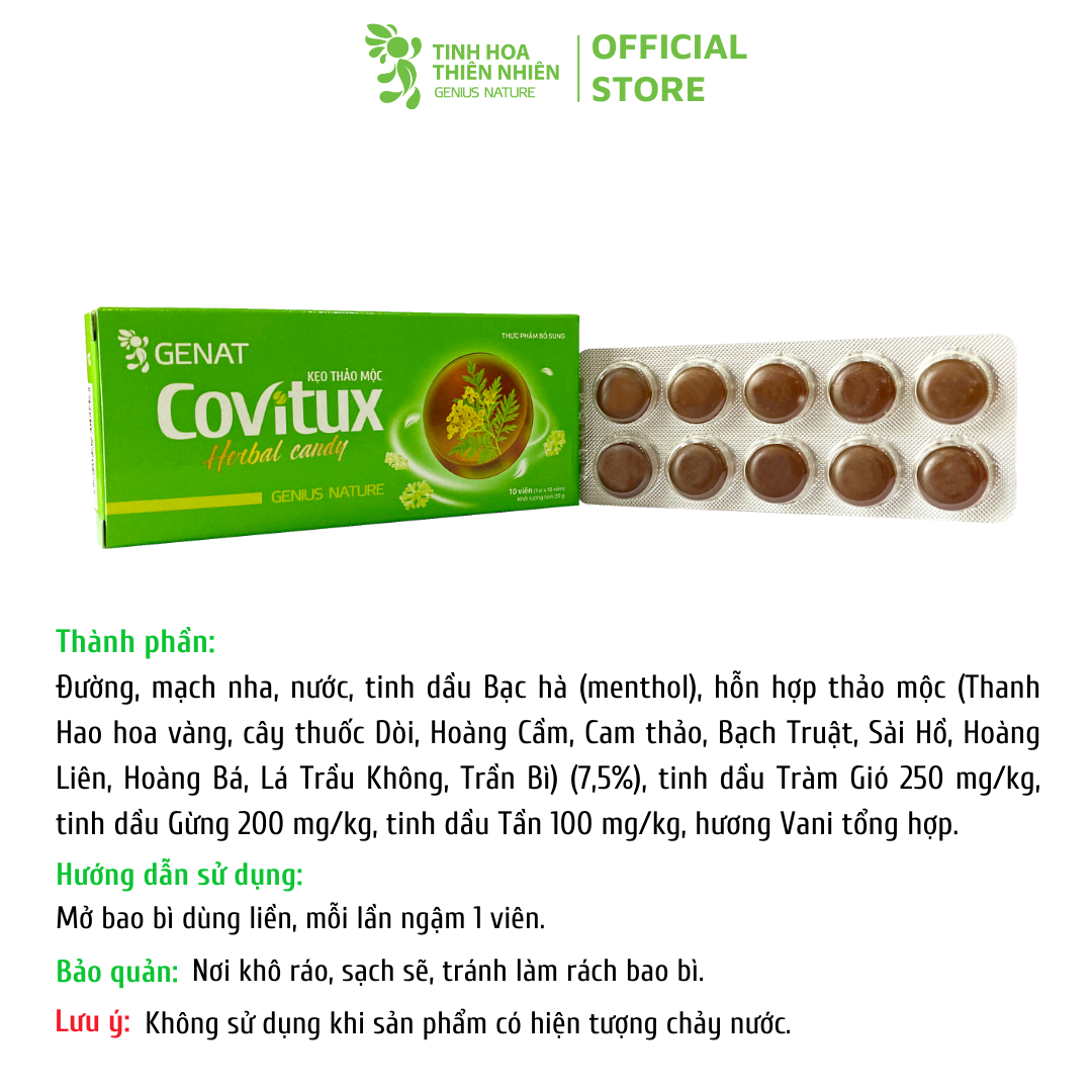 Thành phần: Đường, mạch nha, nước, tinh dầu Bạc hà (menthol), hỗn hợp thảo mộc (Thanh Hao hoa vàng, cây thuốc Dòi, Hoàng Cầm, Cam thảo, Bạch Truật, Sài Hồ, Hoàng Liên, Hoàng Bá, Lá Trầu Không, Trần Bì) (7,5%), tinh dầu Tràm Gió 250 mg/kg, tinh dầu Gừng 200 mg/kg, tinh dầu Tần 100 mg/kg, hương Vani tổng hợp.