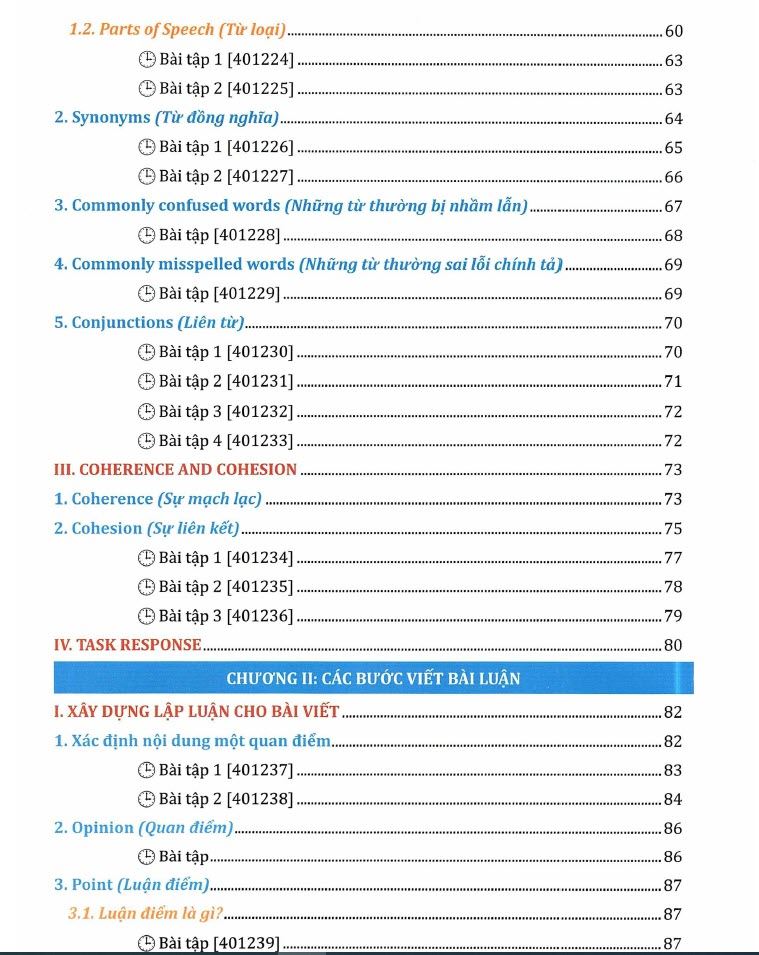 • Chương 2: Các bước viết bài luận. Trong phần này, các bạn sẽ được hướng dẫn cách xây dựng lập luận cho bài viết và cách viết bài Writing Task 2 một cách cụ thể.