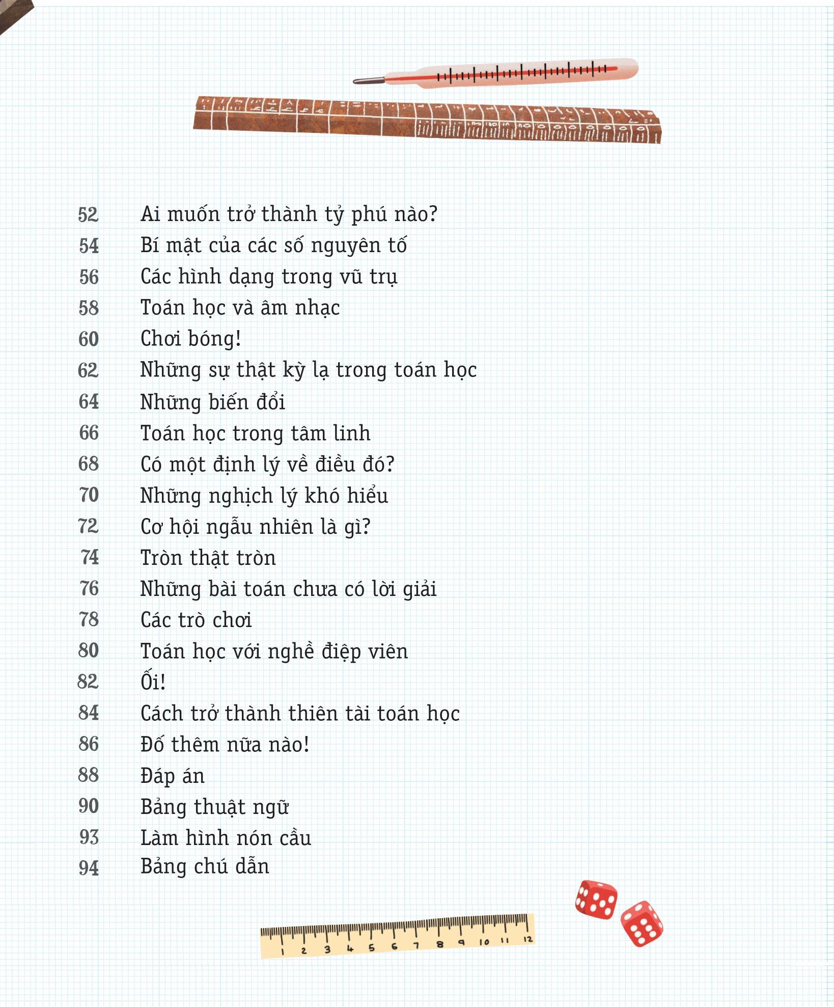 Mua tại TiktokKhám Phá Toán Học Thú Vị Quanh Ta Với cuốn sách này, bạn sẽ đi từ bất ngờ này đến bất ngờ khác trên hành trình khám phá những điều thú vị về toán học, hàng trăm sự thật tuyệt vời và không kém phần kỳ lạ về toán học sẽ được hé lộ thông qua gần 100 trang sách. Toán học bắt nguồn từ đâu? Động vật có biết đếm không nhỉ? Định lý bánh mỳ giăm bông là gì thế? Tại sao số 0 lại là số hữu ích nhất trong tất cả các số? Toán học có thể giúp bạn giành chiến thắng trong các trò chơi như thế nào? Bạn đã sẵn sàng tìm kiếm câu trả lời cho những câu hỏi này chưa?