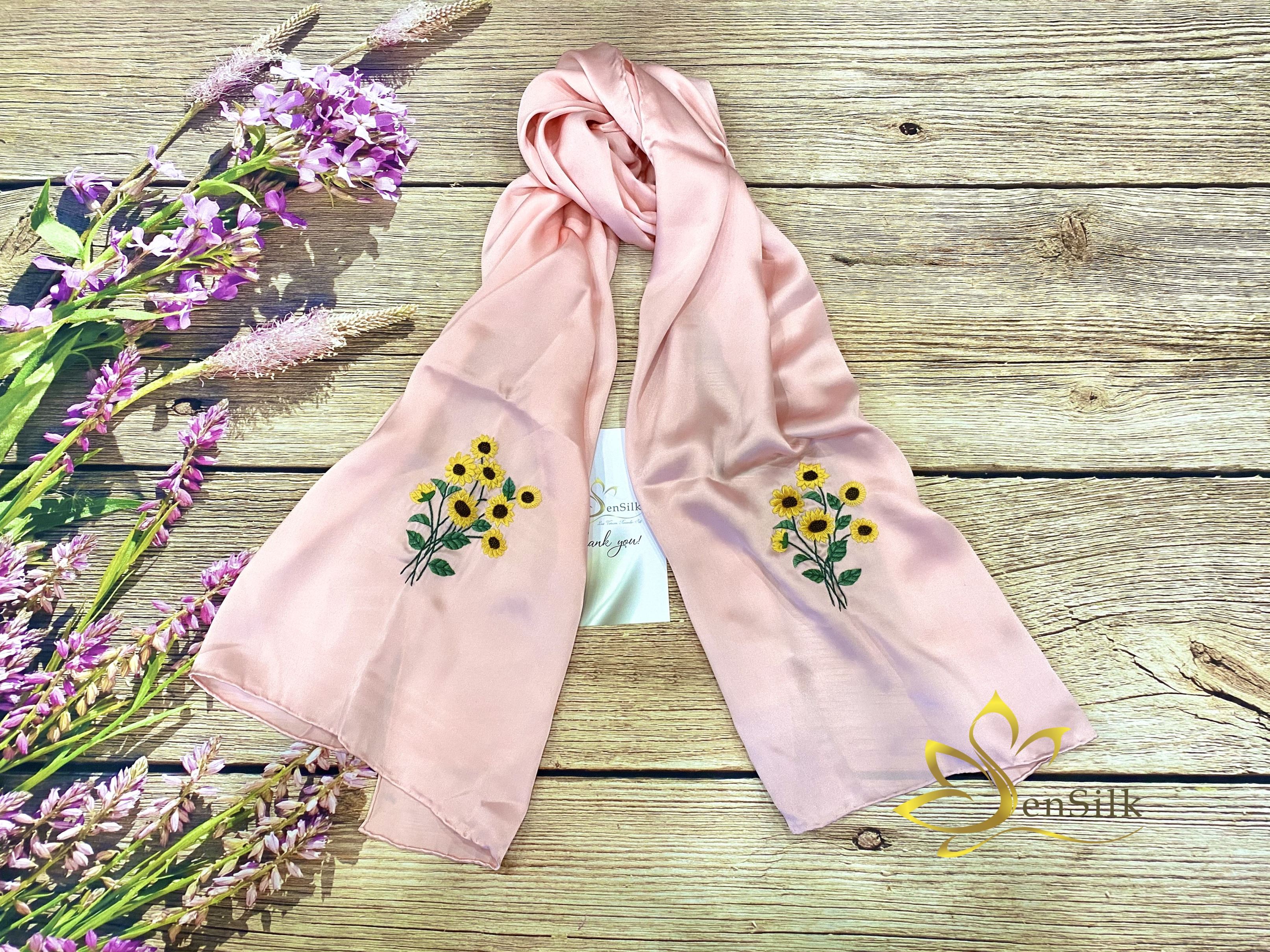 Khăn Lụa Thêu Hoa Hướng Dương SenSilk loài hoa tình yêu luôn hướng về phía mặt trời nên thường là biểu tượng của lòng trung thành, chung thủy sâu sắc, sự kiên định đó cũng biểu thị cho sức mạnh, uy quyền, sự ấm áp…