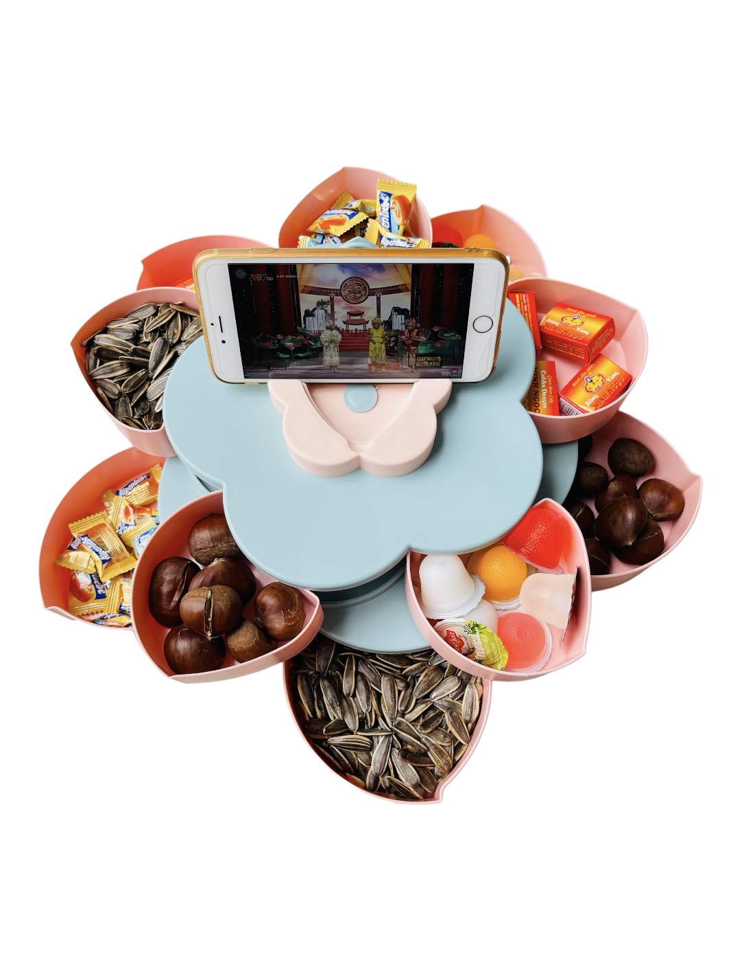 Khay mứt tết 2 tầng xoay 360 độ nhựa cao cấp, khay đựng bánh kẹo tết 2025 hình hoa 10 cánh