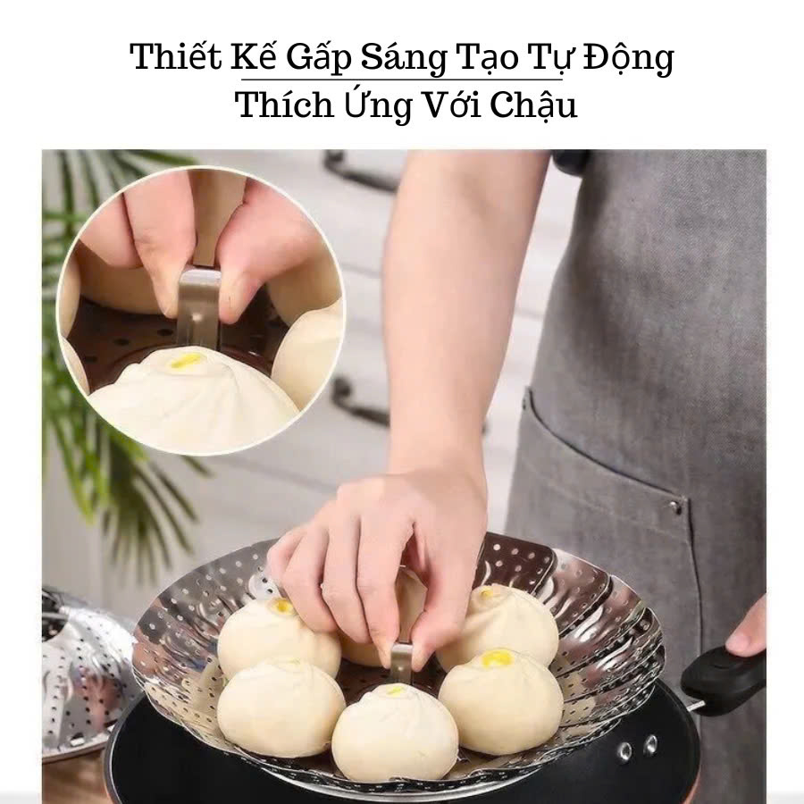 Sản phẩm xửng hấp inox có thể mở ra hết cỡ và thu lại gọn gàng khi không cần sử dụng.