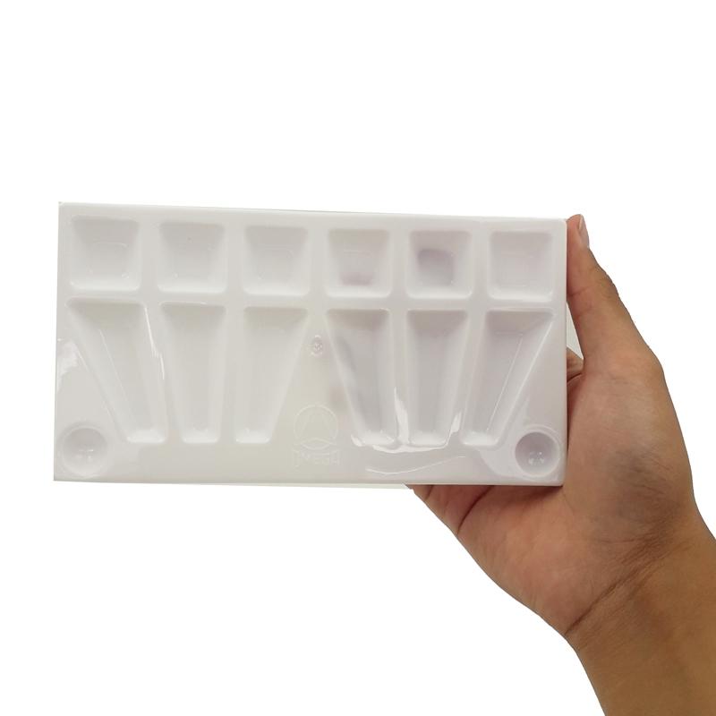 Có 12 khay màu gồm 6 khay nhỏ hình vuông và 6 khay dài hơn hình thang để pha trộn màu giúp tạo ra các tông màu khác nhau.