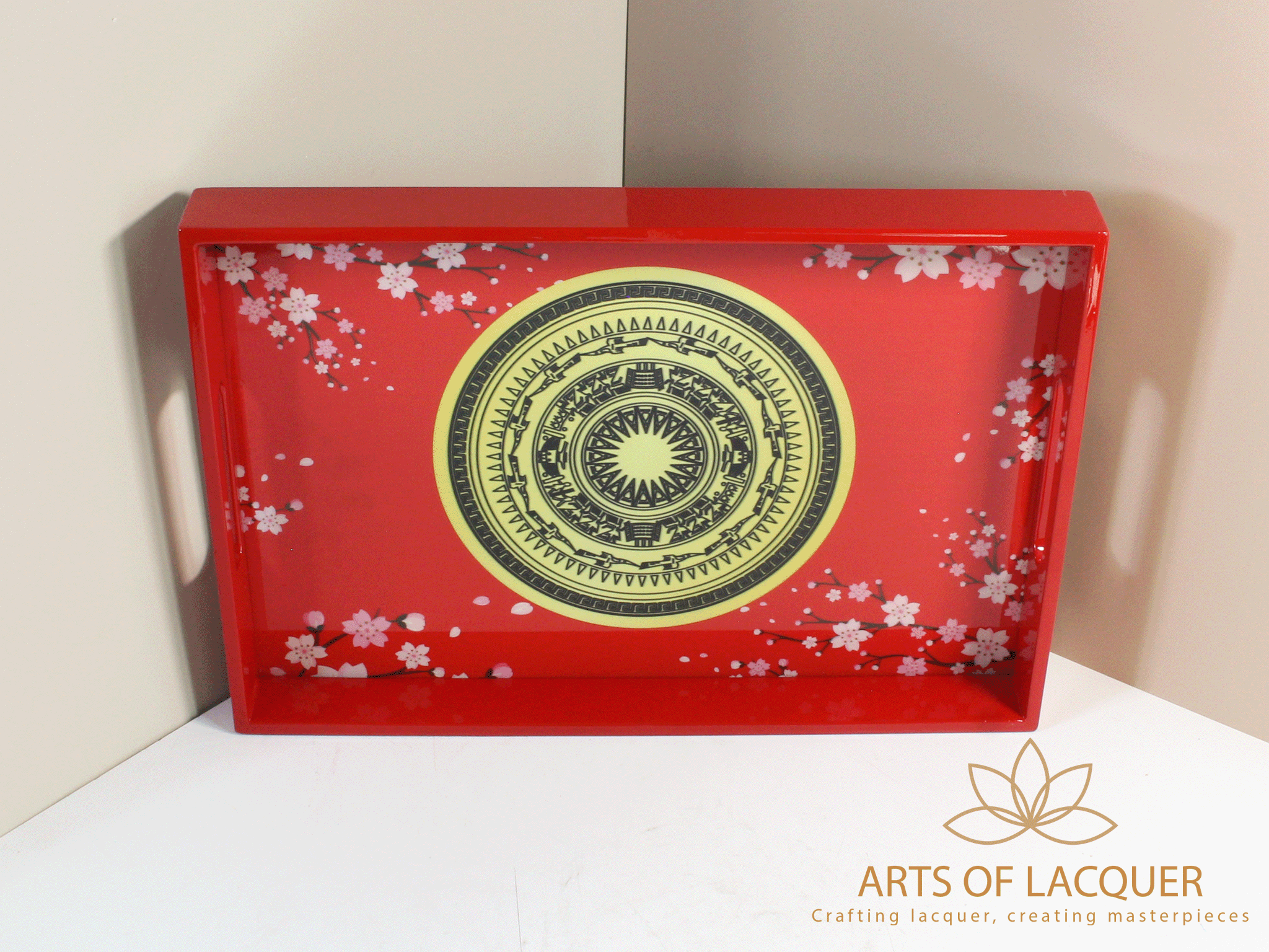 ✨Khay Sơn Mài Hình Trống Đồng Hoa Đào