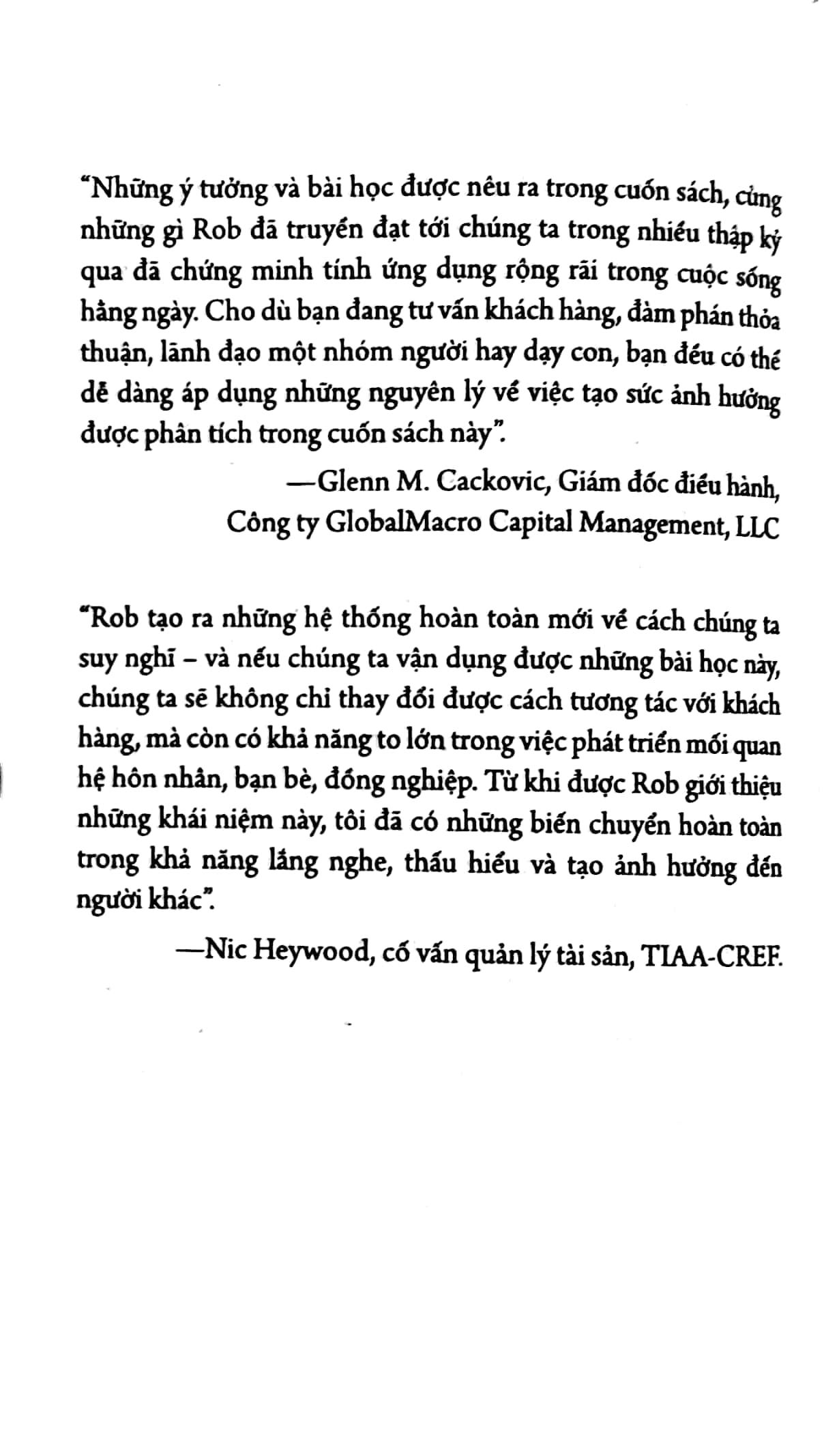 Chắc hẳn bạn biết rất nhiều người cần thay đổi điều gì đó trong cuộc sống của họ, nhưng dù bạn có cố gắng đến mấy, có ý tốt đến mấy, họ vẫn không chịu thay đổi. Bởi lẽ con người về cơ bản đều sợ thay đổi. Là một người kinh doanh, một người cha, một người bạn và cũng là một chuyên gia tư vấn, Rob Jolles hiểu rất rõ viễn cảnh ấy.Từ kinh nghiệm kinh doanh thành công và nhiều năm nghiên cứu, Rob Jolles đã đúc kết lại một công thức đơn giản giúp bạn dẫn dắt những người khác tự khám phá ra họ cần thay đổi những gì và vì sao. Có thể bạn muốn bán được hàng, cũng có thể bạn đang muốn cải thiện một mối quan hệ, dù có là gì thì những lời khuyên hữu ích của Jolles, cùng với những câu chuyện ví dụ thông minh, cảm động và hài hước của anh sẽ giúp bạn hiểu rằng thay đổi suy nghĩ của một ai đó là một hành động xuất phát từ sự quan tâm và tình cảm, cũng như từ niềm tin chắc chắn vào chính bản thân bạn.