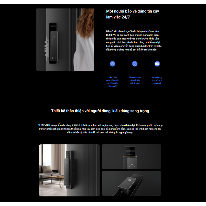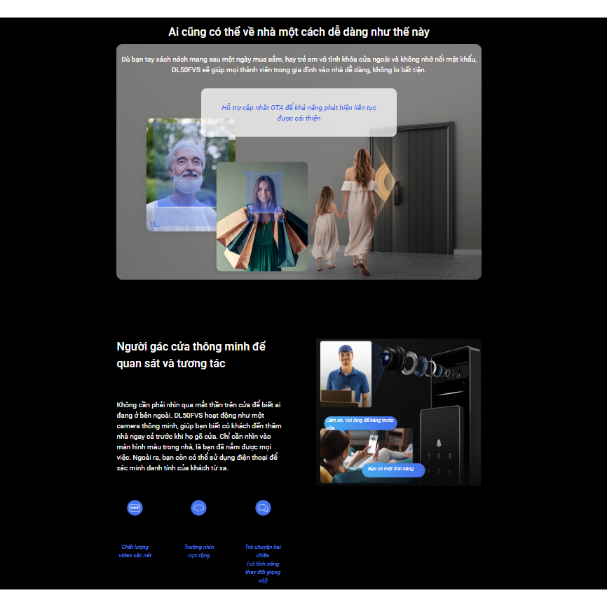 – Hỗ trợ mã khóa chống nhìn trộm, chế độ riêng tư, quản lý người dùng, thông báo thời gian thực, khóa chống kiểm tra, báo động chống giả mạo, điều khiển từ xa, gọi video, thay đổi giọng nói, phát hiện lang thang.